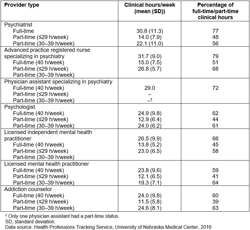 Providers may hold more than one license. However, each provider is counted only once in this study. In case a provider held more than one license, the health professional was assigned a license based on the following hierarchy: psychiatrist, psychologist, APRN, PA, LIMHP, LMHP, LADC. The HPTS database contains information on time distribution of the behavioral health providers. The time spent with patients was calculated as the percentage of hours out of 40 hours per week spent in clinical practice for full-time employed providers. For part-time employed providers, time spent with patients was calculated separately (Table 1). Full-time/part-time status for the providers was calculated and reported regarding full-time equivalent (FTE). Total FTE was calculated by counting a full-time provider as 1.0 FTE and a part-time provider as 0.5 FTE. Using 0.5 FTE to quantitatively represent the part-time provider contributions was considered the best approach as a consensus resulting from feedback from administrators of behavioral healthcare organizations and behavioral health providers.