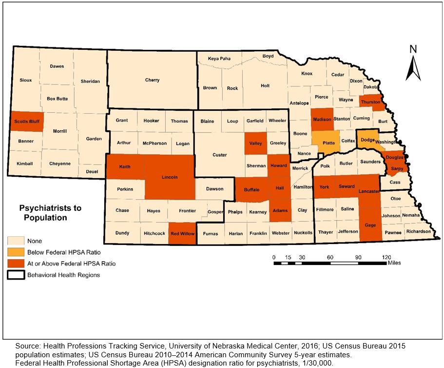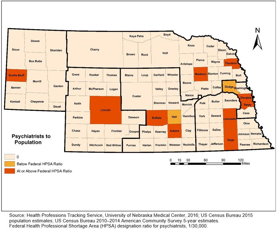 Figure 2: Psychiatrist-to-population ratios based on primary practice locations in Nebraska, 2016.