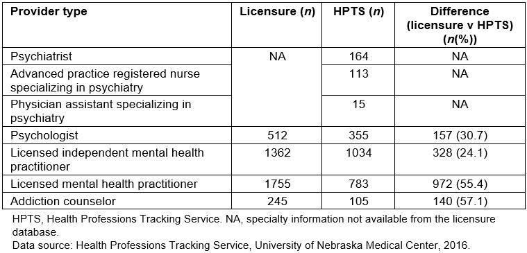 Table 2: Comparison of number of behavioral health providers in Nebraska based on licensure and Health Professions Tracking Service data, 2016