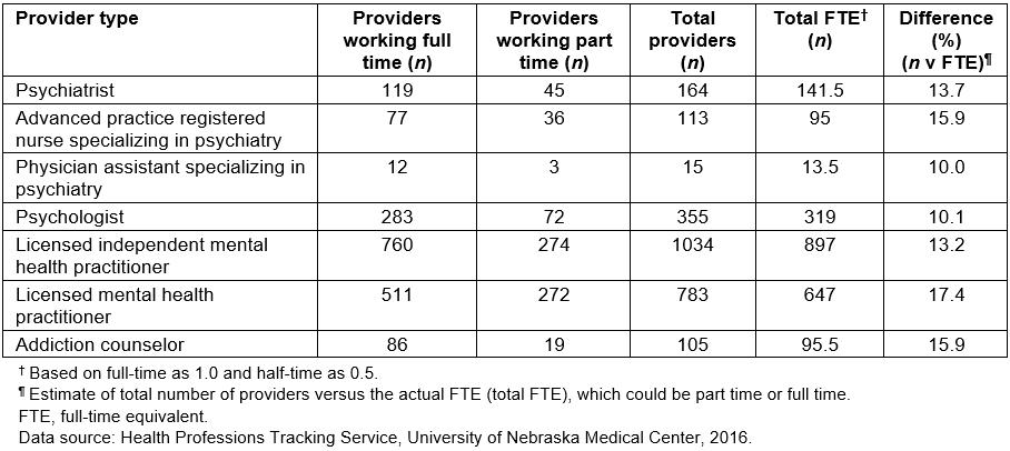 Table 3: Supply of behavioral health providers by work status in Nebraska based on Health Professions Tracking Service data, 2016