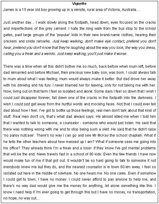 Figure 1: Vignette. Although entirely fictitious, this case vignette was informed by the experiences of the second author (DA) who grew up in a rural area of Western Victoria, Australia.