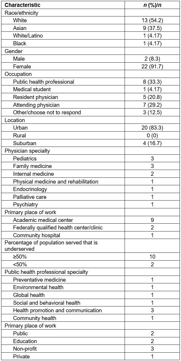 Eighty-six percent (24/28) of former student-teachers responded to the survey. The respondents to the survey included public health professionals, physicians and medical students in a variety of specialties (Table 2).