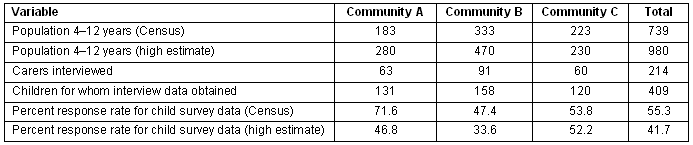 In total, 214 carers completed questionnaires for 409 children; 131 (32.0%) from Community A, 158 (38.6%) from Community B and 120 (29.3%) from Community C. The response rate of the child survey based on Census data (generally regarded as an undercount) was 55% across the three communities, ranging from 47% in Community B to 72% in Community A. Response rates based on other population estimates were somewhat lower (Table 1).