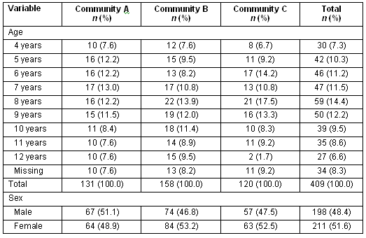 The ages of children for whom data were obtained were reasonably evenly spread across the target age range, with slightly smaller numbers in the higher and lower ages. There were no significant differences between communities by sex (Table 3).