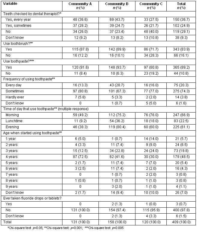 Approximately one-third (37%) of children were reported to have had their teeth checked every year by a dental therapist, although this varied significantly between communities (range 28% to 44%; Table 4). Most children (84%) were reported to use a toothbrush, but again there were significant community variations (Table 4). While 89% of children were reported to use toothpaste (with a similar significant variation between communities), only 20% of these children were reported to use it every day (Table 4). Time of toothpaste use was reasonably evenly distributed between morning (67%) and evening (61%), with some children reportedly using it twice a day, and a small proportion reporting use at lunchtime (23%). Across all communities, the most common age that toothpaste application began was 4 years (49%) and less than 2% of children had ever taken fluoride tablets or drops.