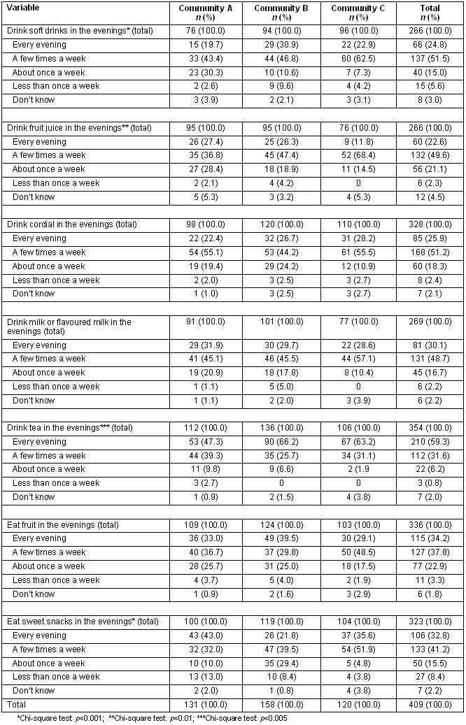 Over three-quarters of children who reportedly consumed softdrinks, cordial, milk or flavoured milk in the evenings drank such beverages at least a few evenings each week (Table 5). Over 90% of children across the three communities who reportedly drank tea, and about three-quarters of those who consumed sweet snacks, did so at least a few evenings each week (Table 5).