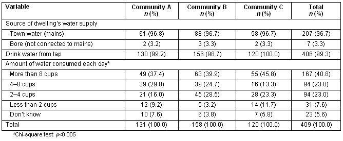 Almost all (97%) carers reported that their house was connected to the community water supply (Table 6) and most (99%) children sourced their drinking water from a tap (household or otherwise; Table 6). Approximately two-thirds (64%) of children were reported to drink more than 4 cups of water a day