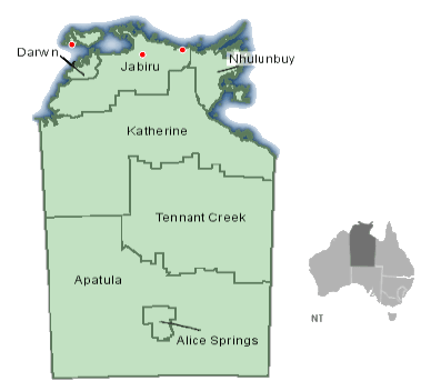 Figure 1: Location of the three study communities in relation to Darwin, Northern Territory (communities highlighted in red).