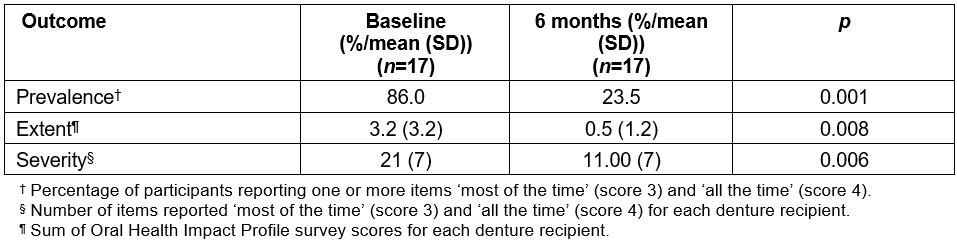 The purpose of this study was to evaluate the impact of the service on OHRQoL of the patients who received the dentures. OHRQoL was assessed using the shortened version of the Oral Health Impact Profile survey (OHIP-14)3. Denture recipients between July and December 2016 were invited to participate in the evaluation, completing an OHIP-14 survey at baseline and 6-month follow-up (January–June 2017), in a culturally safe manner, as an interviewer-assisted survey with an Aboriginal dental assistant. Twenty-eight recipients (82%) participated in the survey at baseline, 17 (61%) were able to be followed up. The effect of oral health on quality of life was improved in all measurement scores. At baseline, 86% of the participants had at least one item scored as ‘most/all of the time’ for oral health problems; at follow up this dropped to 23% (p=0.001). The ‘extent’ of the effect of oral health on quality of life, the mean number of times a participant ranks one of the 14 items as ‘most or all of the time’, was also significantly reduced at follow-up (3.2 v 0.5, p=0.008). The ‘severity’ of the effect of oral on quality of life, the mean overall sum of all OHIP items, was 21 out of a possible 56 at baseline; this was significantly (p=0.006) reduced at follow-up to a mean of 11 for all participants (Table 1).