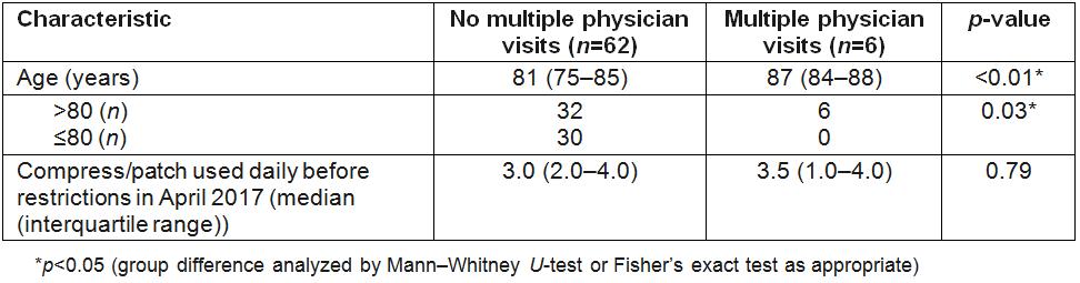 Table 1: Profile of groups with and without multiple physician visits after implementation of restrictions on the prescription of compresses/patches