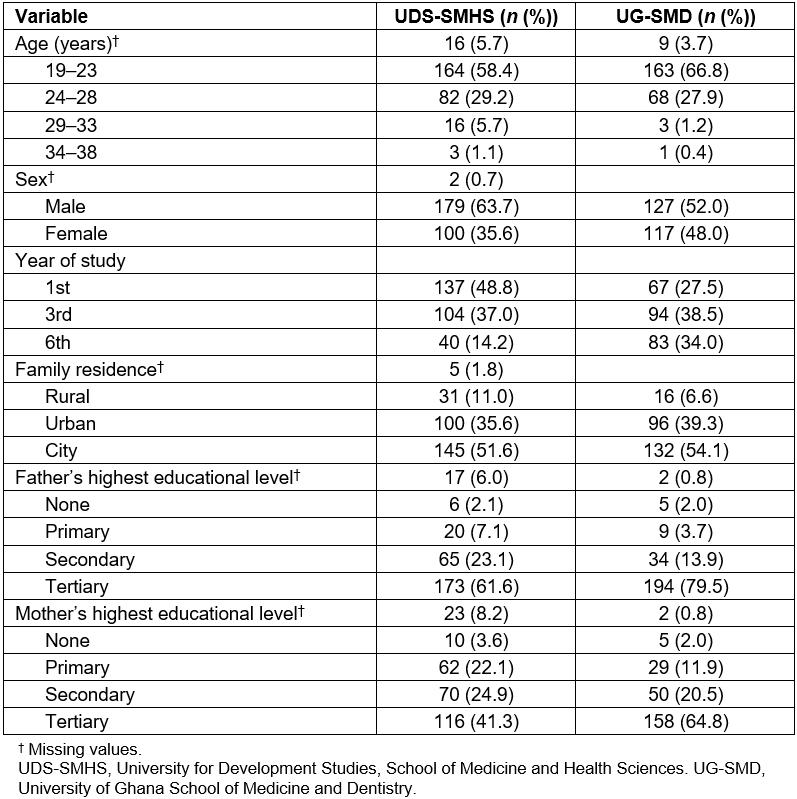 UDS-SMHS and UCC-SMS adopted a PBL/COBES curriculum, whilst University of Ghana School of Medicine and Dentistry (UG-SMD) in Accra and Kwame Nkrumah University of Science and Technology School of Medical Sciences in Kumasi use the traditional method32. In Ghana, undergraduate medical training consists of 3 years basic sciences and 3 years clinical training.