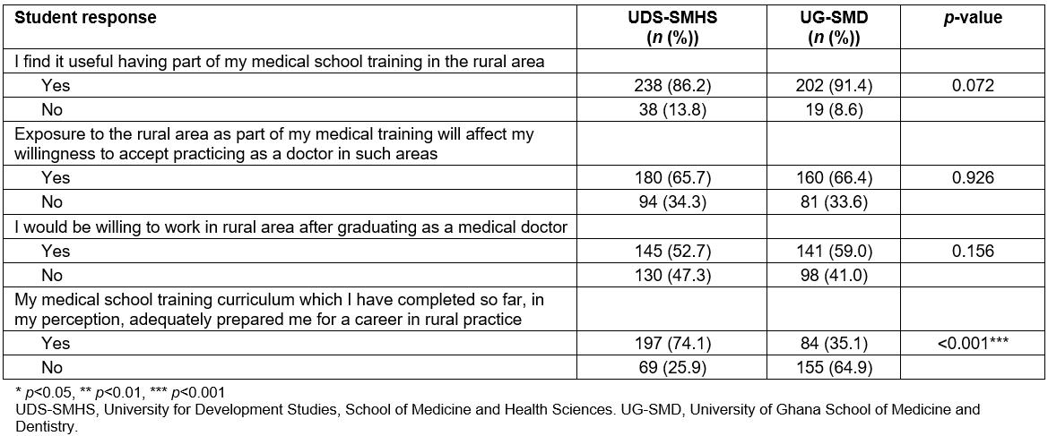 Table 3: Student responses to ‘I would be willing to work in the rural area after graduation’
