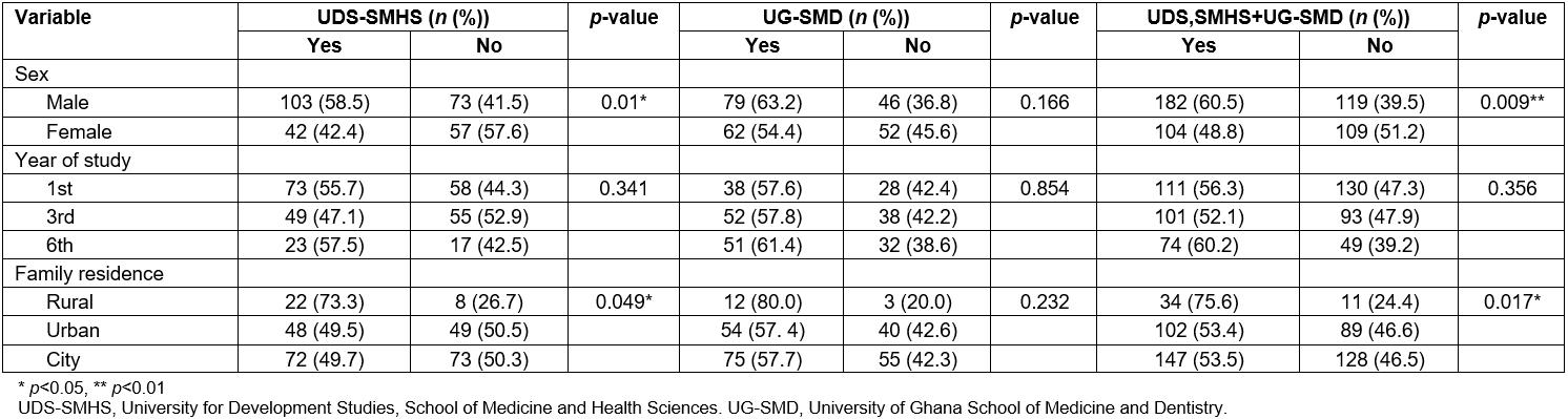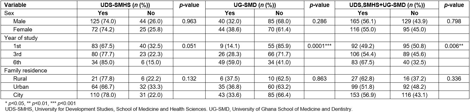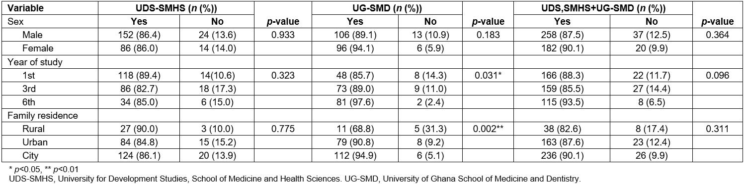 This study had a cross-sectional descriptive design, using a paper-questionnaire consisting of 25 items of both open- and close-ended questions, administered onsite to all students after their respective lecture sections. Students from UG-SMD and UDS-SMHS participated in the study.