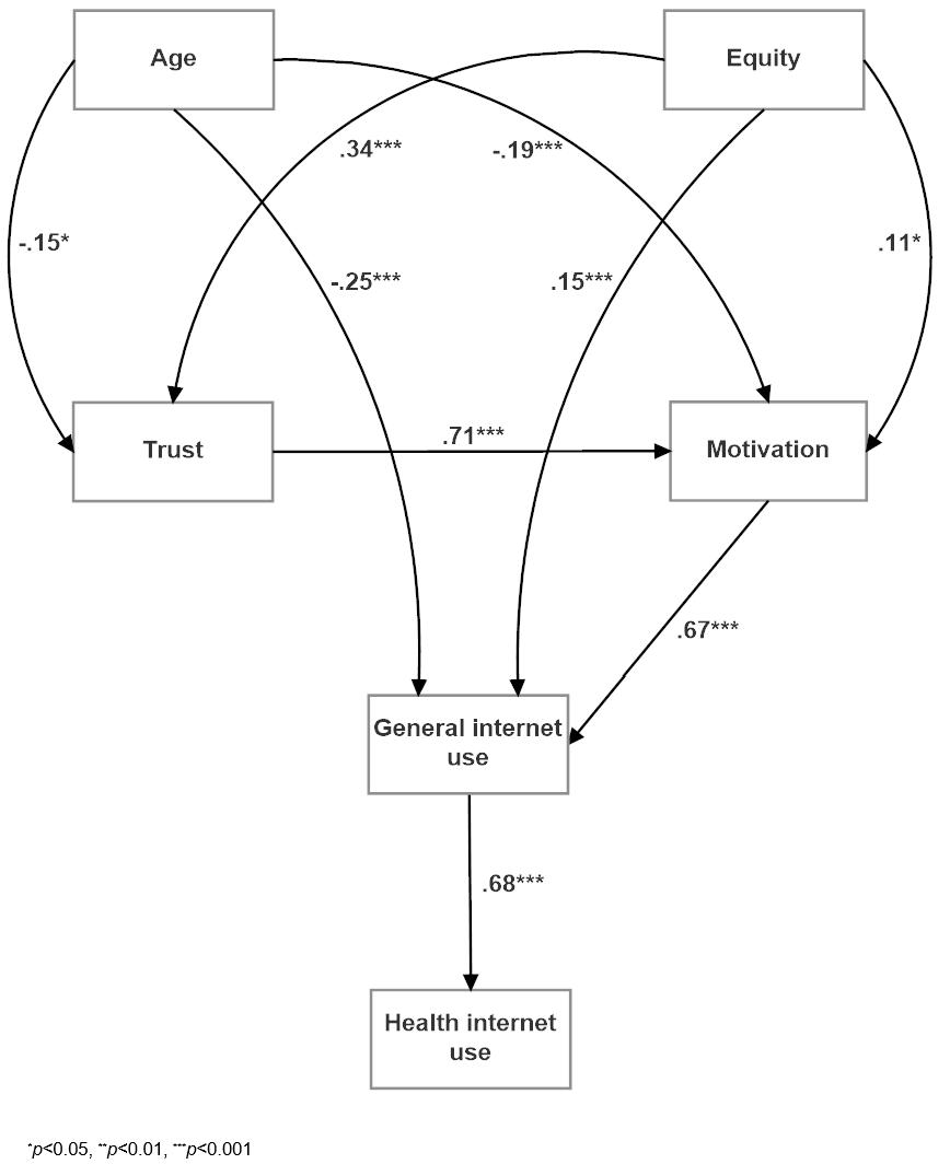 In the present context, the relatively simple procedure of path analysis was used to examine the hypothesised associations between multiple ‘predictor’ variables of general internet use and internet use for health purposes, respectively, while general internet use is also purported to be a predictor of internet use for health. Trust and motivation were proposed as predictors of both forms of use, with trust hypothesised to precede motivation. Age and equity were proposed as exogenous variables, being potential predictors of all other components of the model.