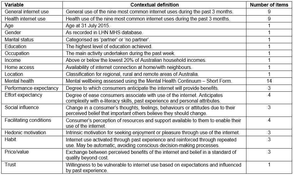 Policymakers and service providers are acutely interested in leveraging internet use to facilitate positive health outcomes. However, it would appear that the first step remains a more fulsome appreciation of barriers to and enablers of internet use. Assessing these factors using quantitative methods allows for consideration of both the direct and indirect relationships at play that could help to target future decision-making. Such evidence may inform the efficient allocation of resources and the appropriate design of initiatives to produce innovative solutions. As these developments would appear to be particularly advantageous to rural mental health consumers, the goal of the current study was to assess the factors associated with internet use in general and for health purposes specifically.