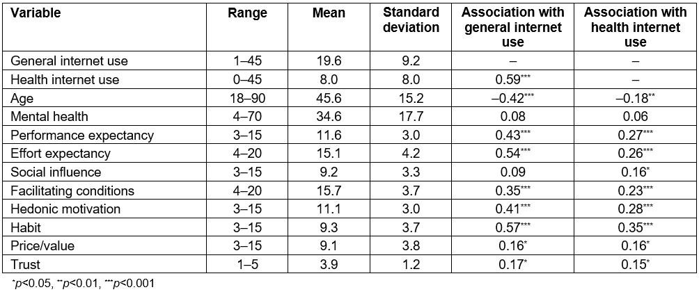 Table 2: Summary of continuous study variables and their associations with internet use
