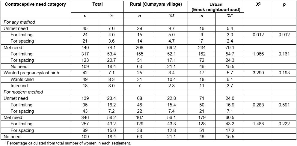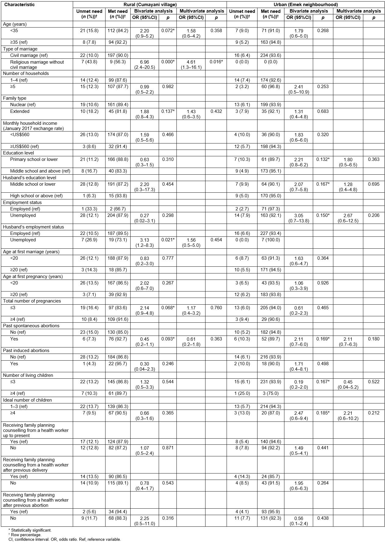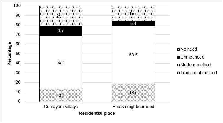 This study was conducted to determine the levels and associated factors of unmet need for family planning in currently married women aged 15–49 years living in two settlements, rural and urban, in Karabuk Province. The study presents remarkable findings regarding the powerful effects of socioeconomic inequalities and social determinants on women’s fertility behaviours. This was observed in two settlements located close to each other: Cumayani village and Emek neighbourhood. The most striking finding of the study was that the strongest determinant of unmet need for family planning was religious marriage without civil marriage.