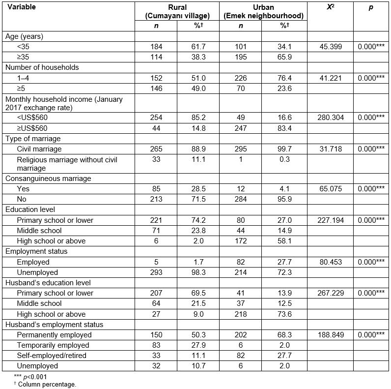 In the study, 594 currently married women (298 from Cumayani village and 296 from Emek neighbourhood) were reached. The ages, household incomes and education levels were significantly lower in the rural women than in the urban women (p<0.001). Thirty-three rural women (11.1%) and only one urban woman were married by way of a religious ceremony (p<0.001). The women and their husbands living in the urban settlement had higher education and employment levels than did the women and their husbands living in Cumayani (p<0.001) (Table 1).