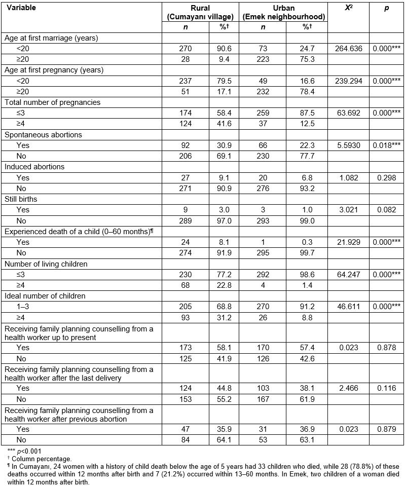 The rural women married and became pregnant at an earlier age than the urban women did (p<0.001). The total number of pregnancies, spontaneous abortions, living children and the ideal number of children were higher in Cumayani than in Emek neighbourhood. The number of women with a history of child deaths under 5 years was 24 (8.1%) in Cumayani, while it was only 1 (0.3%) in Emek neighbourhood (p<0.001). There was no difference between the two settlements in receiving family planning counselling (Table 2).