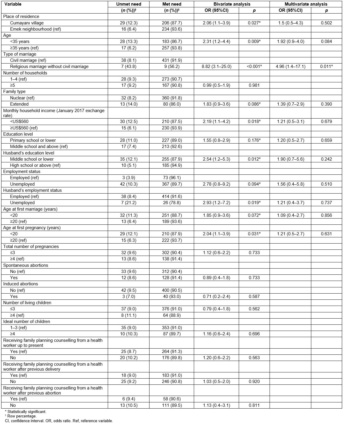 The strength of the present study is that it concretely demonstrates the relationship between religious marriage without civil marriage (which is an important problem in Turkey) and unmet need. One of the limitations of this study was the small number of individuals in the sample, which included those living in only two settlements. Another limitation was that the data on the subgroups was limited.