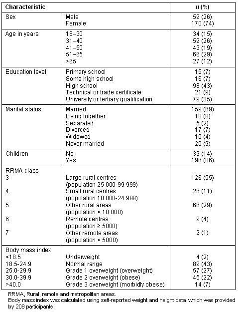 Formal ethical clearance for this study was granted by The University of Queensland Medical Research Ethics Committee. The study was set in central Queensland. Based on the Rural, Remote and Metropolitan Areas (RRMA) classification scheme21, participants' localities of residence included large rural centres (population 25 000-99 999, RRMA 3), small rural centres (population 10 000-24 999, RRMA 4), other rural areas (population < 10 000, RRMA 5), remote centres (population ≥ 5000, RRMA 6) and other remote areas (population < 5000, RRMA 7).