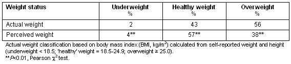 Table 2: Lay perceptions of healthy weight: differences between actual weight status and perceived weight status (n = 209)