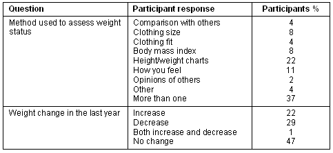 Self-assessment of weight: Participants were asked, 'How would you assess your own weight?'. The response categories were 'underweight'; 'acceptable or healthy weight'; and 'overweight'. This was followed by the question, 'To answer the question above, how did you assess your weight?'. The response categories were 'comparison to others'; 'clothing size'; 'clothing fit (loose/tight)'; 'body mass index'; 'height/weight charts'; 'how you feel'; 'opinions of others'; or 'other'. Some participants selected more than one option and this was recorded as 'more than one'.