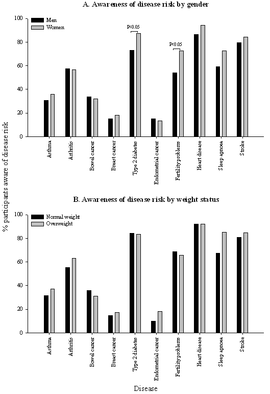 The widespread awareness of the association between overweight and increased risk of arthritis, type 2 diabetes, fertility problems, heart disease, sleep apnoea and stroke in our study may evince the success of extensive public health campaigns that have addressed the modifiable risk factors of these chronic diseases. Conversely, the limited awareness of rural men and women regarding the relationship between overweight and increased risk of asthma, bowel cancer, breast cancer and endometrial cancer may be a consequence of the limited attention that has been given to overweight as a potential cause of these diseases. While a 1994 Australian study did show that urban men and women were aware that overweight worsens asthma and lung cancer15, there is considerable variation among the population regarding awareness of overweight as a risk factor for cancer46. Only a few studies have investigated lay knowledge of overweight as a risk factor for bowel, breast and endometrial cancer and these indicate that the general population are unaware that overweight is a risk factor for these diseases46-49. This lack of awareness is not surprising, given that overweight is considered to be a minor risk factor for these diseases and that there is considerable controversy in the medical community regarding the link of overweight with asthma50-52 and cancer53,54.