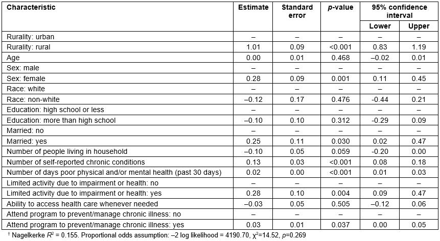 Table 1 presents sample characteristics by rurality. Overall, approximately 69% of participants resided in a rural county. On average, participants had 5.65 (standard deviation (SD): ±6.86) doctor’s office visits and traveled 346.32 (±872.72) km (215.19 (±542.28) mi) for medical care in the previous 12 months. The average age of participants was 64.90 (±7.53) years, and the majority of participants were female (62.4%), white (92.9%), married (77.9%), and had more than a high school education (73.6%). On average, participants self-reported 3.53 (±1.91) chronic conditions and 7.24 (±10.57) days of poor physical/mental health. Approximately 43% of participants reported they experienced limited activity due to their impairment or health problem, and 13.5% reported having attended a program to prevent or manage a chronic illness. When comparing participant characteristics by whether or not the participant resided in a rural county, a significantly larger proportion of participants with a high school education or less resided in a rural county. On average, participants residing in a rural county were younger, traveled further to medical services in the past year, had more days of poor physical/mental health, and lower ability to access health care when needed.