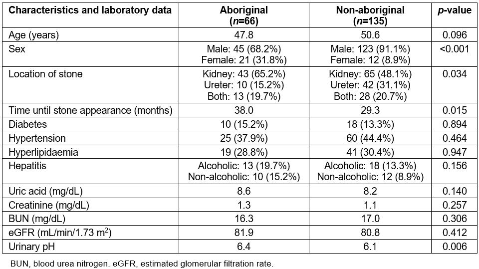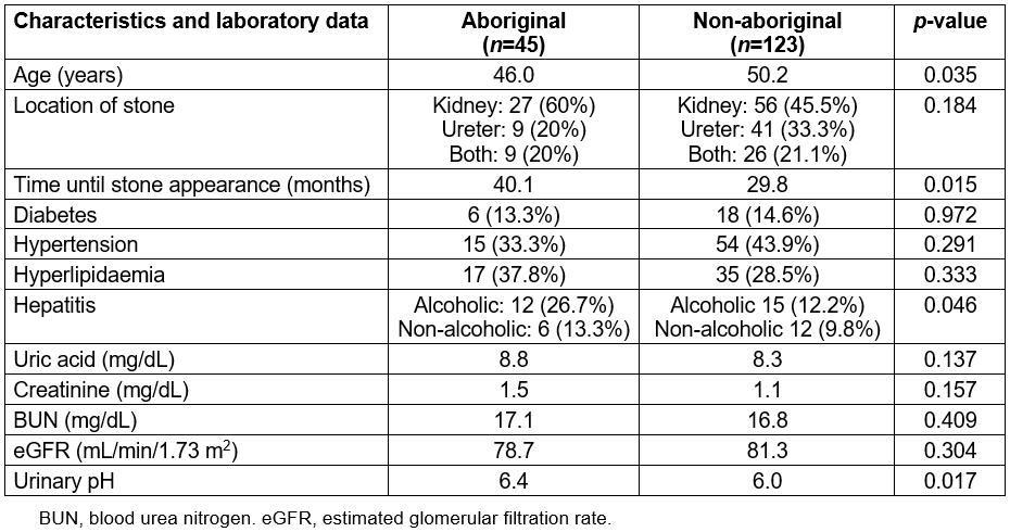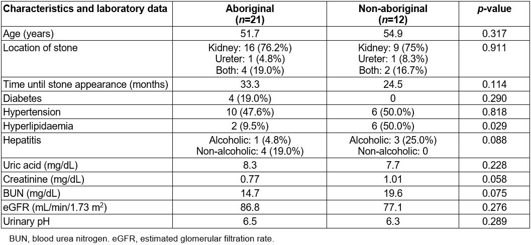 A χ2 test was used to compare differences in ethnicity, sex, location of stone and underlying diseases between aboriginal and non-aboriginal patients. A t-test was used to examine the age, time until stone appearance, serum levels of uric acid, creatinine, BUN, eGFR and urine pH.