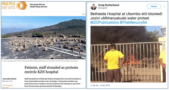 64 Gonzales LL. Patients, staff stranded as protests encircle KZN hospital. Durban: Health-e News, 2015. Available: https://www.health-e.org.za/2015/11/06/hospital-patients-staff-stranded-as-water-protests-encircle-district-hospitalweb link (Accessed 11 March 2018).
