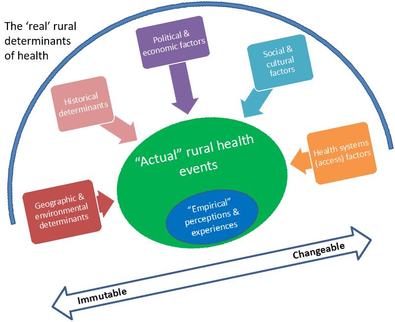 Rural health needs to be based on robust theory that guides efforts in practice, teaching and research. This could make the sets of assumptions that are inevitably brought to bear on prioritization and decision-making more explicit. It has not yet been described in theoretical terms because to insiders such as health practitioners it seems to be more of a practical endeavour than an academic one. The rural determinants of health, as a more specific expression of the social determinants of health, include issues of geography and topography in addition to the social, economic and political factors that result in the persistent disadvantage in health access and outcomes of rural populations.