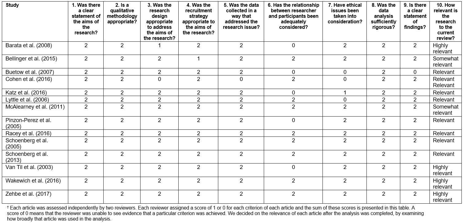 All published qualitative research relevant to the research question was included and there were no limitations on the search based on qualitative methodology or independently assessed quality. Quality appraisal of the studies was performed using the Critical Appraisal Skills Programme Qualitative Checklist39. The results of critical appraisal are presented in Appendix I to inform the evaluation of studies; however, the authors did not use appraisal to exclude studies from this review. This decision comes from an ongoing debate amongst qualitative scholars about the usefulness, appropriateness and approaches to critical appraisal of qualitative research. The authors’ perspectives on this issue are detailed elsewhere40. Studies that contained findings not supported by data were also excluded from this study, consistent with the qualitative meta-synthesis method described in the next section41.