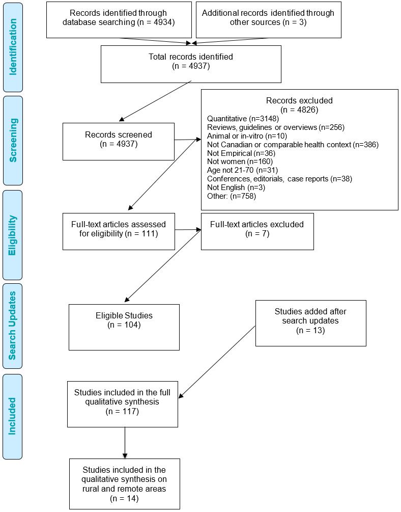 This systematic review represents a secondary analysis of a subset of data retrieved as part of a larger systematic review conducted under a contract with the Canadian Agency for Drugs and Technologies in Health (CADTH)16. The initial systematic review was conducted in collaboration with CADTH, as part of a health technology assessment of HPV testing for the purpose of cervical cancer prevention16. In the initial review, the authors synthesized 117 qualitative research studies about women’s experiences and perspectives of CCS without placing any restriction on geographic area or demographic features of women. The present review focuses on a subset of this large dataset, studies that concern the experiences and perspectives of women living in rural and remote areas.
