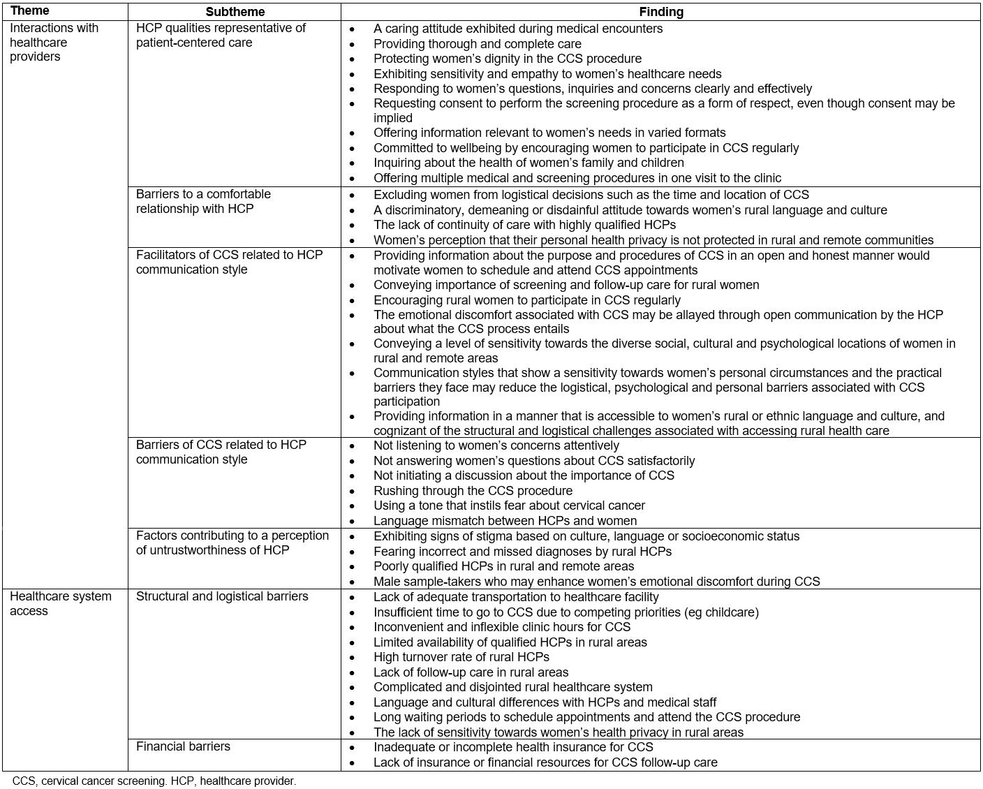 Women also described limited availability of qualified HCPs in their rural location50,52, and the HCPs that were available were not taking new patients52. Some had concerns about limited access to follow-up care in their rural community in the event of a positive finding from a CCS screening test52,53,56,58.