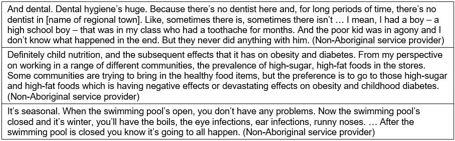 All participant groups raised the issue of skin infections, particularly the burden on children. Poor nutrition due to a lack of access to affordable, healthy food options in local community stores was raised as contributing to skin infections, poor dentition and early onset diabetes. Some parents and service providers believed skin infections had decreased since improvements to the community’s water supply and establishment of a swimming pool (Box 1).