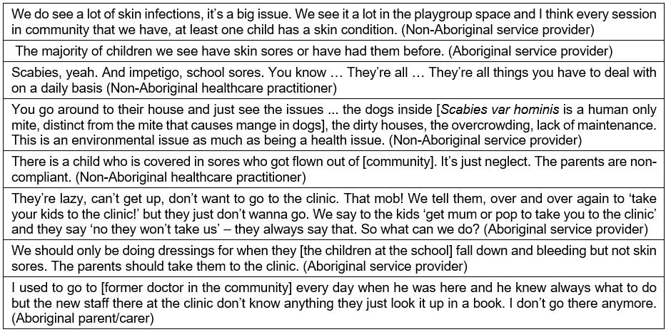 This is the first qualitative study in a remote Aboriginal community setting to document parent/carer, healthcare practitioner and service provider attitudes and practices regarding skin infections, and their perceived impact on child health and wellbeing. This study reveals that skin infections are a normalised yet pervasive child health and development issue, which adversely impacts on children’s wellbeing and school participation. The findings are consistent with previous studies in remote communities showing high rates of clinic presentations for skin infections24, with a recent community clinic audit in the same communities showing 16% of childhood presentations for skin infections23.
