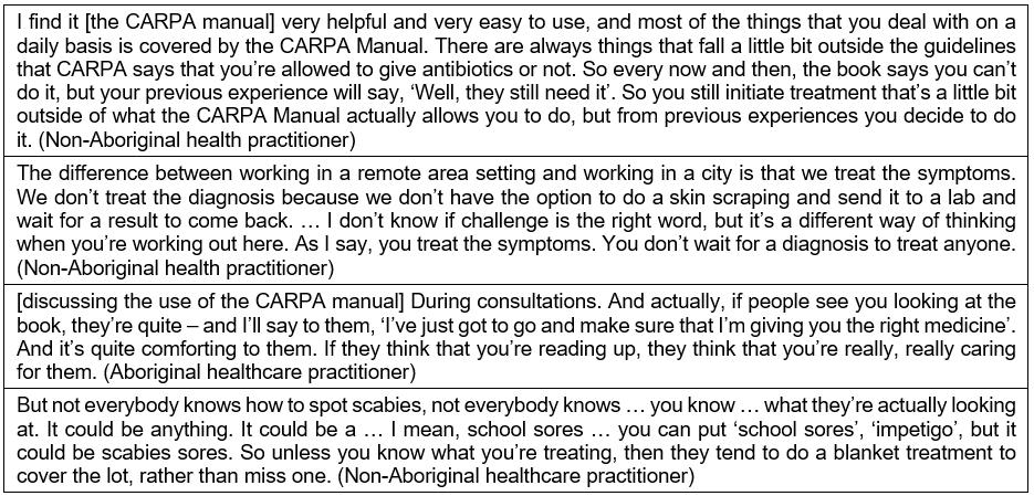All healthcare practitioners referred to the Central Australian Rural Practitioners Association (CARPA) manual11 as an essential guideline for the diagnosis and treatment of skin infections. However, some used treatment outside the CARPA recommendations such as Bactroban (mupirocin), a topical antibiotic that is contraindicated in the CARPA manual, due to the risk of antimicrobial resistance22.