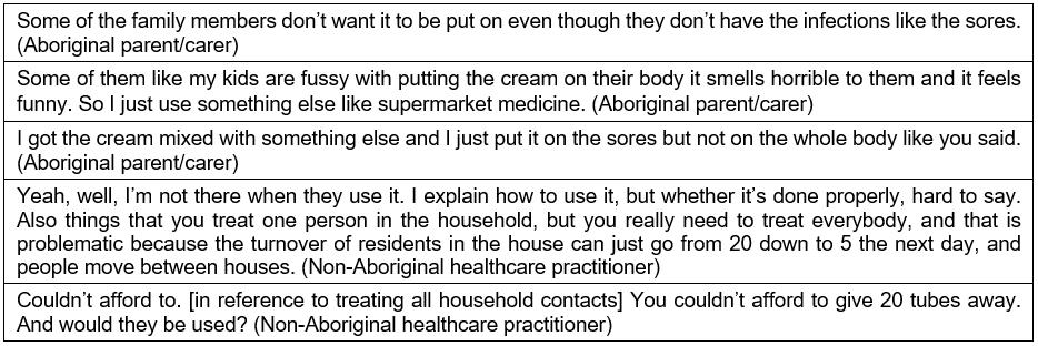 Not surprisingly, parents/carers also expressed confusion regarding the application process for using the scabies cream. Many were not aware of the need to apply the cream to the entire body. Some carers spoke of the smell, the ‘funny’ texture, and the time it took for the skin infections to heal when using the cream as potential barriers to treatment uptake (Box 5).