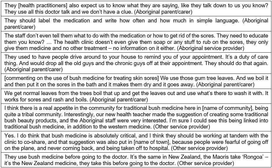 Most parents/carers discussed the effectiveness of ‘bush medicine’ for themselves, their children and families in treating scabies and skin sores. All participants acknowledged the use and benefits of traditional ‘bush medicine’ for treating skin infections, an idea supported by some healthcare professionals who agreed it could be beneficial to explore the use of bush medicines in conjunction with western medicine.