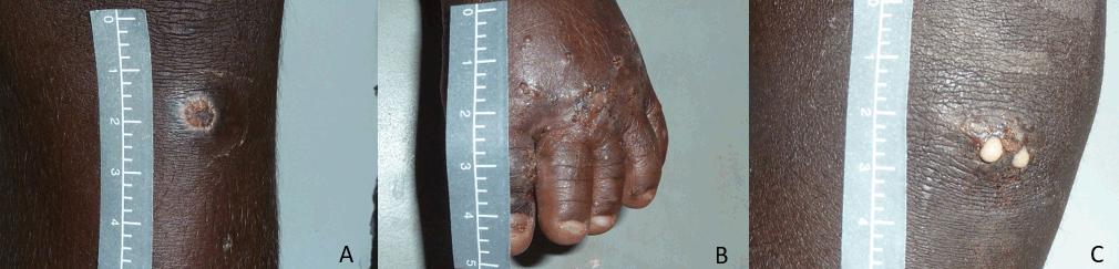 Figure 1: Images of skin infections of different severities. These images were shown to participants. in the study to gauge knowledge and understanding of when treatment was indicated. A. Healing impetigo. B. Scabies with secondary bacterial infection evidenced by the presence of papules with honey coloured crusts. C. Purulent impetigo.