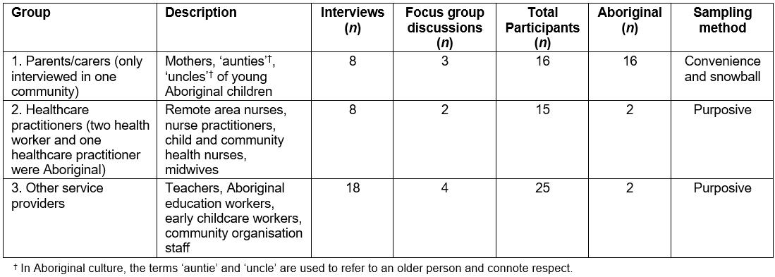 A series of semi-structured, face-to-face interviews and focus group discussions were conducted using a culturally appropriate yarning methodology19 with parents/carers of young children in the largest community, and healthcare practitioners and service providers servicing all four communities and the regional town. All interviews and focus group discussions were conducted by IAD (female) or DH (male) between October 2014 and November 2015. Interviews and focus group discussions were between 20 and 120 minutes in length. All interviews were recorded and both researchers reviewed their fieldwork observations throughout the study.