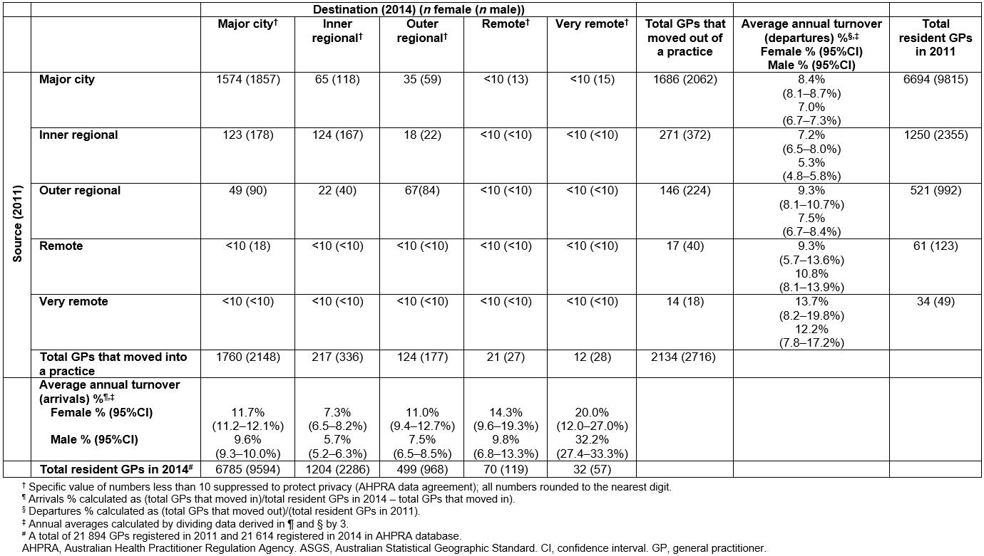 Examining those GPs who moved practices between 2011 and 2014 (not counting those commencing or leaving practice as movers) overall around 7.4% (95% confidence interval (CI): 7.2 7.6%) of all GPs left their PPP annually (Table 1). Significantly more female GPs (8.4%; 95%CI: 8.0–8.6%)) moved out of their practice annually than male GPs (6.8%; 95%CI: 6.6–7.0%)). Female GPs had significantly greater departure rates in major city and regional (inner and outer) areas than male GPs, ranging between 8% and 9% annually (Table 1). These departure rates were compensated by significantly greater arrival rates among female GPs. A drift out of non-metropolitan areas existed for all GPs. Thus, over the 3-year period 112 female GPs and 205 male GPs moved out of major city areas into more rural areas. In contrast, 186 female GPs and 291 male GPs moved in the opposite direction. Nevertheless, cities remained the largest source and destination of GPs going to and coming from other areas, and most moves were within remoteness categories. Remote/very remote areas show very high rates of movement, which could be real or a statistical artefact from the very small numbers of GPs in these areas, or a combination of these effects.