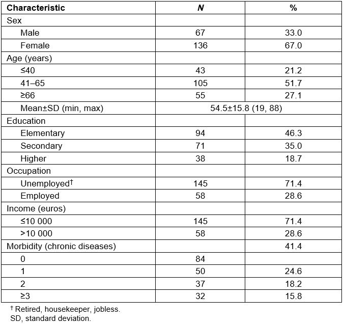 During the 6-week study period, out of a total of 227 patients with a regular appointment, 216 were eligible, with 203 of them participating in the survey (93.9%). If there was no response to a specific item, no answer was recorded. Thus, totals may differ in tables. A respondent profile is shown in Table 2. Overall, the mean age was 54.5 years (standard deviation (SD): 15.8) with the majority being women (136/203, 67%) and 46.3% (94/203) with elementary level education.