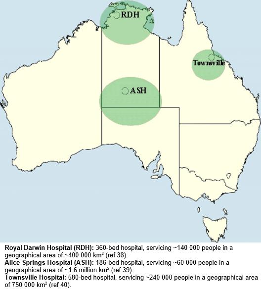 Hospital-based studies included the Royal Darwin Hospital and Alice Springs Hospital in the NT, and the Townsville Hospital in Queensland. The Royal Darwin38, Alice Springs39 and Townsville hospitals40 are 360-, 186- and 580-bed teaching hospitals respectively with each containing the sole specialist paediatric services for their regions (Fig1). Community-based studies were undertaken across the NT, including central Australia, and in Queensland (communities vary according to the original studies, Table 1).