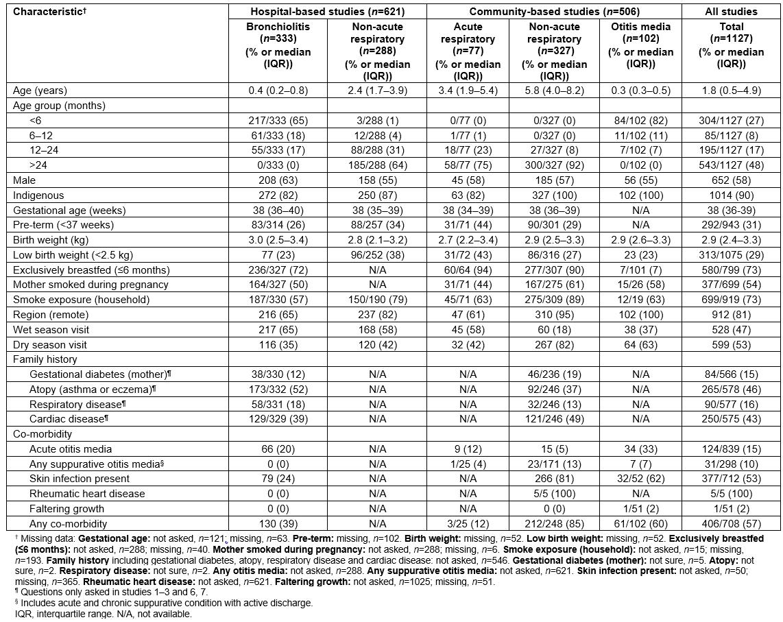 The present study data are consistent with other hospital-based ALRI studies that also include Indigenous infants with bronchiolitis, where RSV was detected in 41–83% of patients4,44,45. In the present study, 31% of children hospitalised with RSV-related bronchiolitis were aged 6–24 months, when maternal RSV vaccination may no longer be protective,46, emphasising the importance of also developing active immunisation programs for young infants. In contrast to hospital-based studies, detection of RSV was low in the seven community-based studies (1.4% of children overall; 2.2% in those with and 0.9% without an acute respiratory illness).