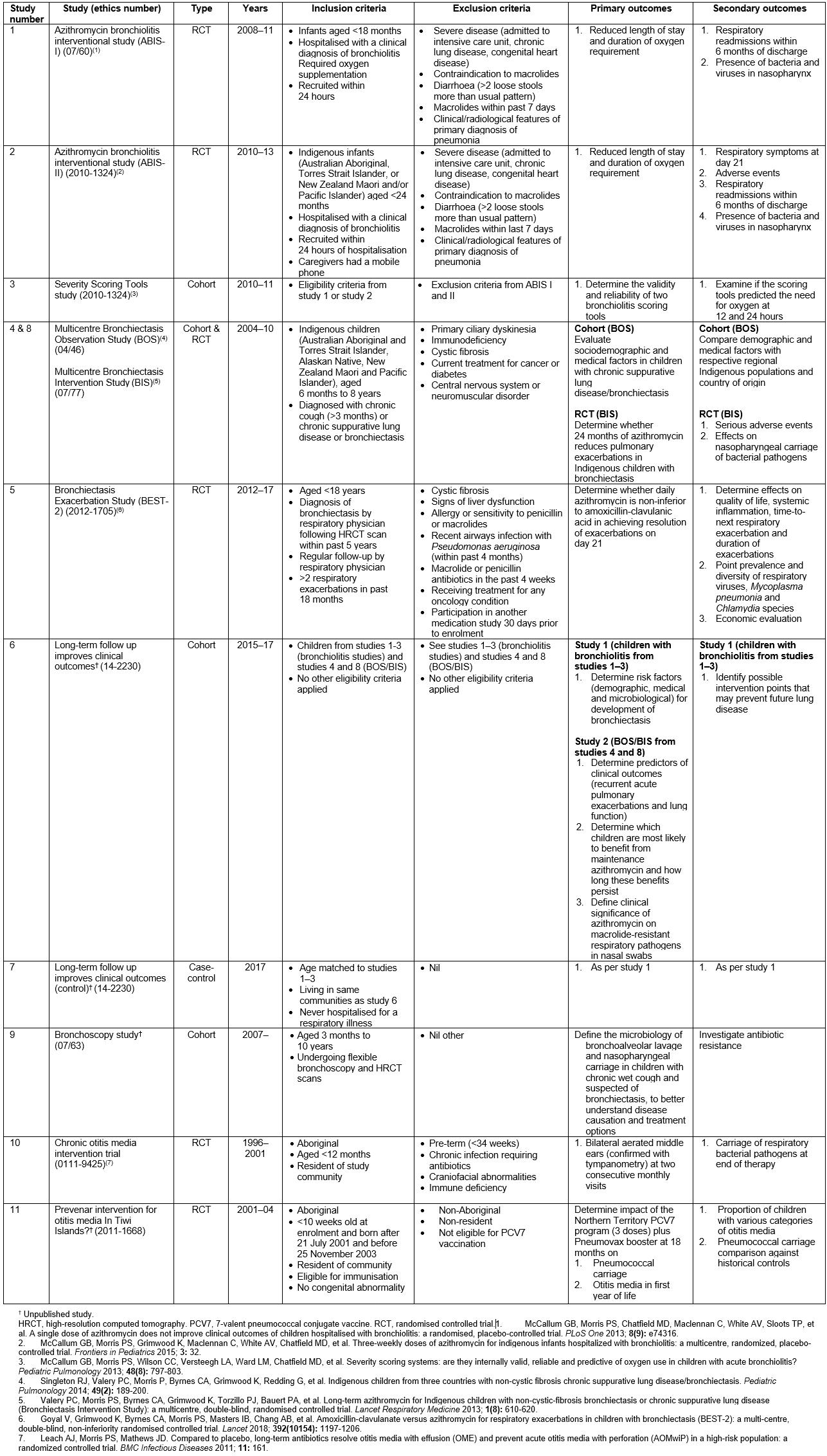 Data were sourced from 11 prospective studies (Table 1). Eight involved children with either acute or chronic respiratory illnesses17,20,32-35, one involved children who acted as case-controls in study 4 and the remaining two focused on otitis media36. These were conducted in the NT, central Australia, and in the northern Queensland city of Townsville between 1996 and 2017 inclusive. One of the studies is ongoing, and the main results (reporting of primary aims) of seven studies and a substudy have been published already17,20,32-37.