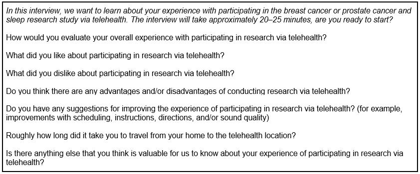 The present analysis aims to evaluate the experience of individuals diagnosed with breast or prostate cancer who participated by telehealth in studies investigating the effects of cancer treatment on sleep and cognition. Evaluation of participants’ experiences will highlight potential benefits of using telehealth and identify ways to improve the process for future studies and assessments.