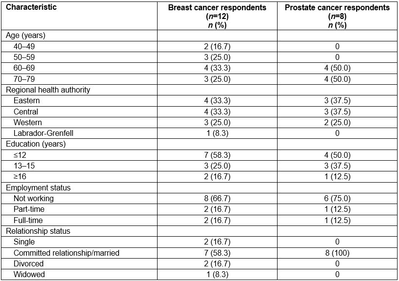 In total, 13 individuals with breast cancer and 10 individuals with prostate cancer were approached. One individual was not interested in participating, and two individuals were too busy at the time to take part. The final sample included 12 individuals with breast cancer and 8 individuals with prostate cancer (Fig1).