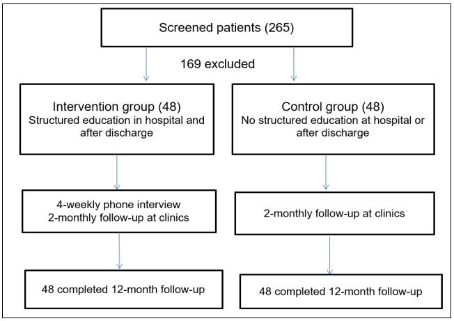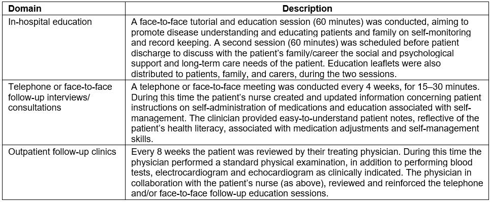 The control group received no structured education at hospital or after discharge, but did receive two clinic follow-ups per month, as per standard hospital practice. All control group participants received standard education on self-management during admission, completed in group sessions, with an information pamphlet given upon discharge. General advice on management and the monitoring of clinical factors/features, including fluid and salt restrictions, monitoring of blood pressure, pulse rate, body weight and urinary output, was given by nurses and doctors as per departmental management protocols before discharge.